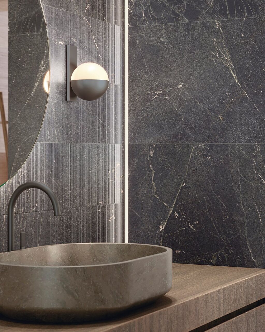 Sempre per dare luminosità alla stanza e accentuare l’eleganza di una scelta di carattere come quella di un bagno nero, la selezione dei materiali è essenziale quanto quella delle luci. Accanto al marmo e alla pietra naturale, grandi classici che sottolineano uno stile classico quanto uno più contemporaneo, spicca il legno, capace di aggiungere calore e organicità all’ambiente sia nella sua versione naturale sia come finitura per la ceramica