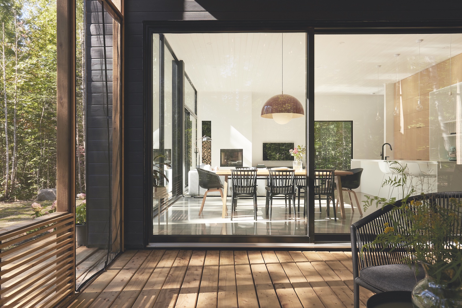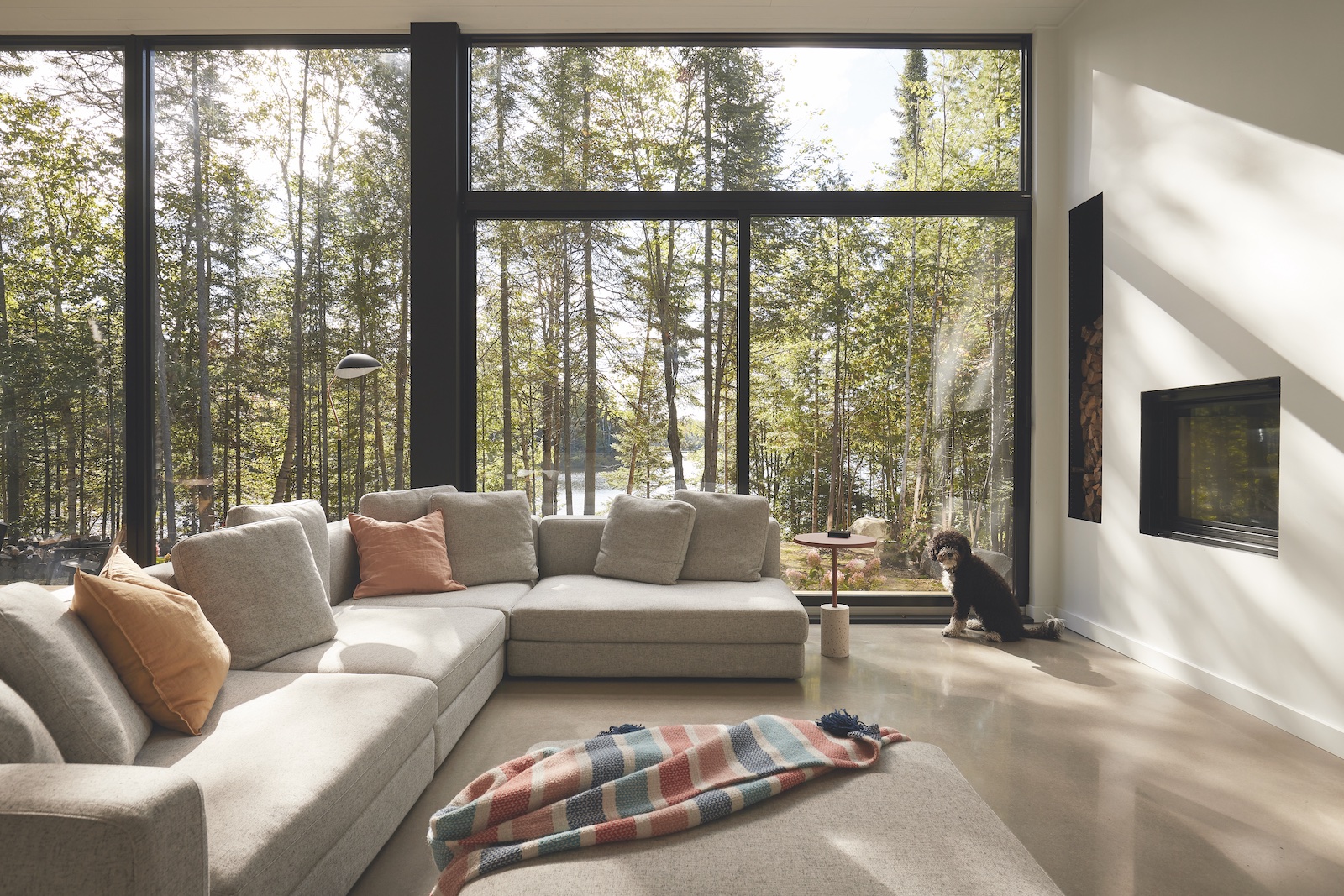 Le tre ampie pareti del living di questa casa nella natura sono completamente vetrate, così da consentire l’illuminazione naturale a tutte le ore del giorno.