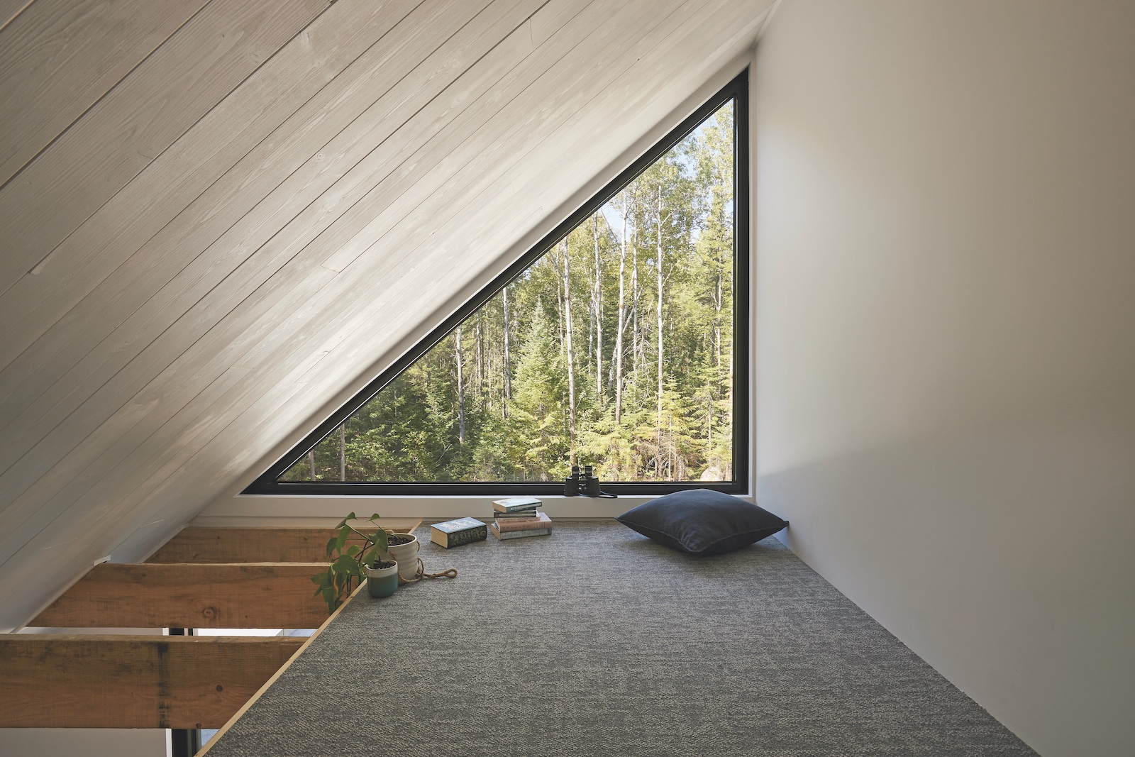 Il soppalco nelle camere dei ragazzi, in questa casa nella natura, è caratterizzato da pareti vetrate triangolari affacciate sul bosco.
