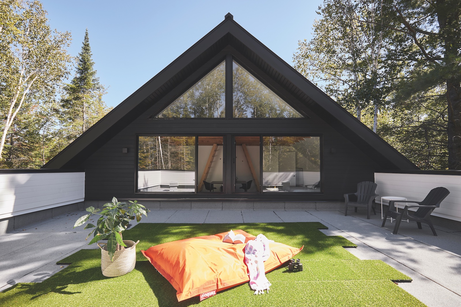 • Il terrazzo panoramico: posizionato al primo piano e accessibile dalle zone notte, il terrazzo si configura come un salotto en plein air. È uno spazio meditativo, pensato per contemplare il lago al tramonto o sorseggiare un calice di vino sotto il cielo stellato del Québec, immersi nel silenzio che solo una dimora immersa nel verde può offrire.