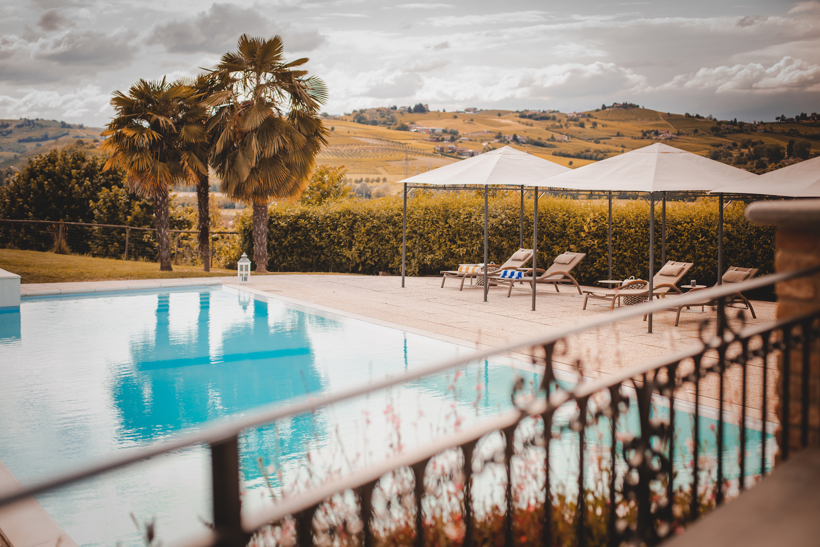 La piscina e, sul fondo, le colline del Monferrato del Relais Almaranto che interpreta le vacanze benessere su misura attraverso programmi che uniscono mindfulness e sport outdoor.